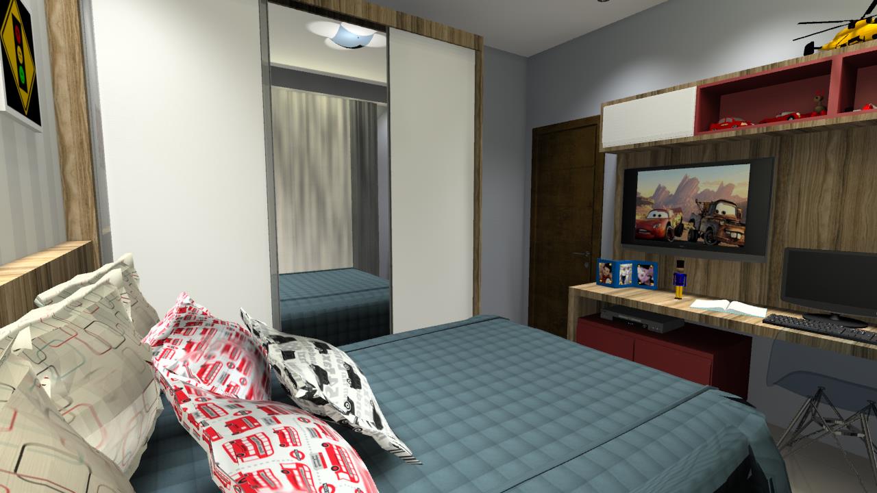 Viviane Machado Arquitetura desenvolveu com muito carinho esse quarto para um cliente de apenas 10 anos, mas muito detalhista. O projeto deveria ter uma cama de 1,40m, roupeiro espaçoso e bem dividido, mesa para computador, TV e nichos para guardar a coleção de carrinhos do dono. O quarto não poderia ser infantilizado, por isso optamos pelo madeirado (para deixar o ambiente mais aconchegante) e o branco; alguns móveis em vermelho dão um toque de cor e alegria ao espaço.