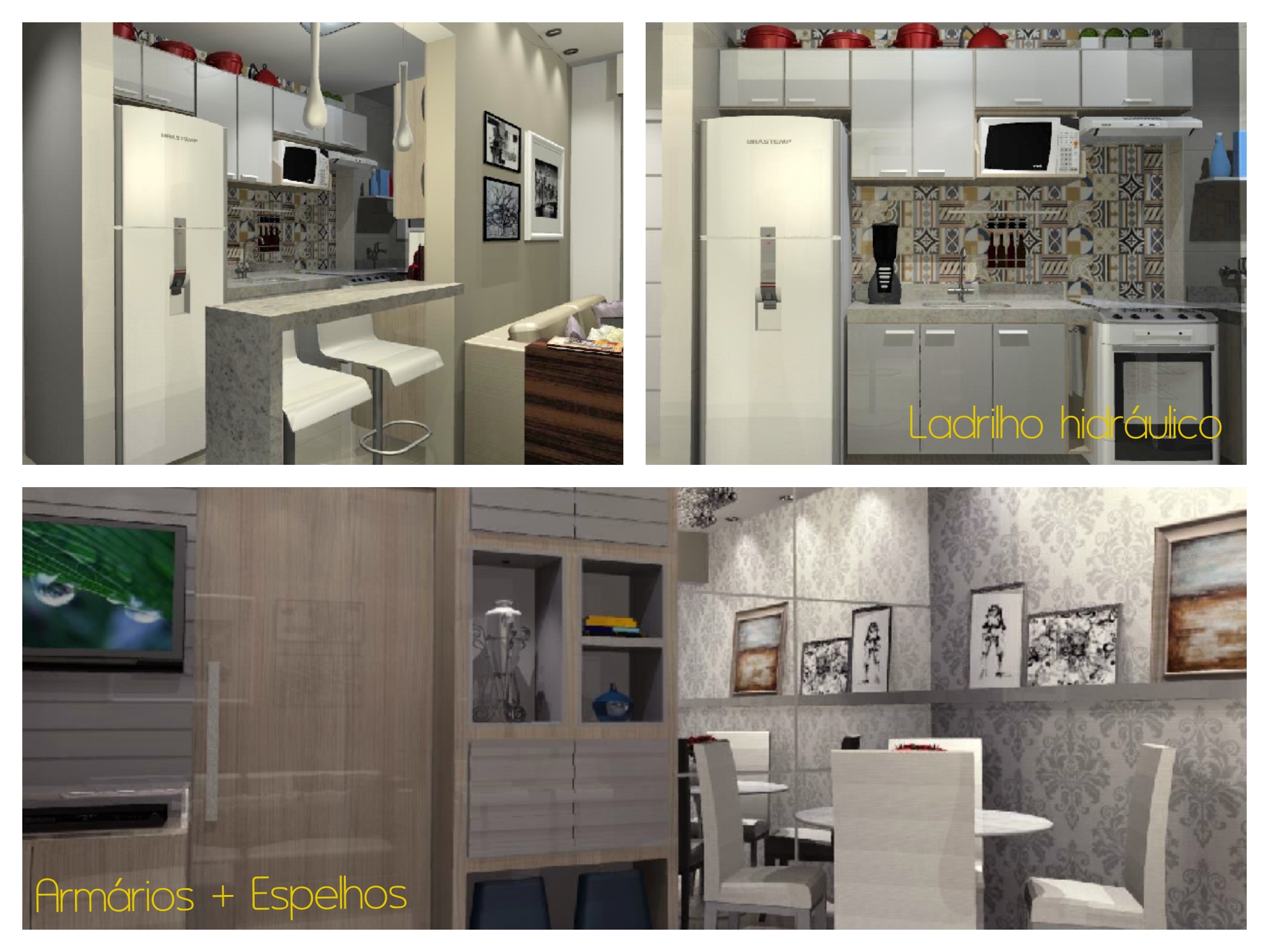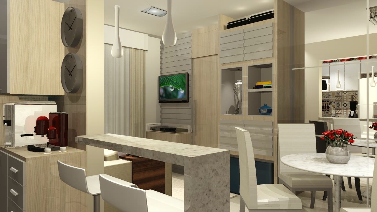 O ponto de partida para a elaboração do projeto foi a integração da cozinha americana com o resto do apartamento, o ambiente deveria ter uma boa comunicação com a sala de estar e jantar, para isso foi pensado no uso de marcenaria planejada com mesmo acabamento nos três ambientes (salas e cozinha), um piso único e paredes com pintura e papel de parede em cores claras, criando um ambiente mais amplo, iluminado e unificado.